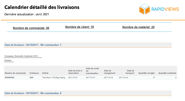 Tableau de bord calendrier des livraisons par société, division, type de schedule line et date