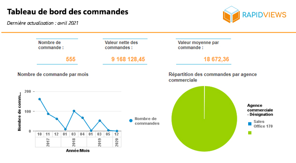 Tableau de bord du volume de commande par années, trimestre, pays, type de commandes. Liens directs vers des rapports détaillés.